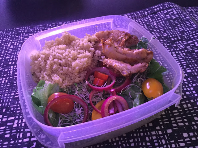 Tämä kana-kvinoasalaatti on paitsi erittäin maukas, myös ravitseva ja tasapainoinen ateria. Se toimii kylmänä ja lämpimänä. Helppo pakata mukaan, kuten kuvasta näkyy. Ainekset voi kasata trendikkääksi salaattibowliksi, tai antaa mennä reteästi sekaisin. Halutessaan joukkoon voi lisätä esimerkiksi pannulla paistettua vuohenjuustoa tai halloumia, mitä löytyy muuten myös lampaanmaitoon tehtynä. Tällä kertaa jäi minulta pois, mutta suosittelen lämpimästi.