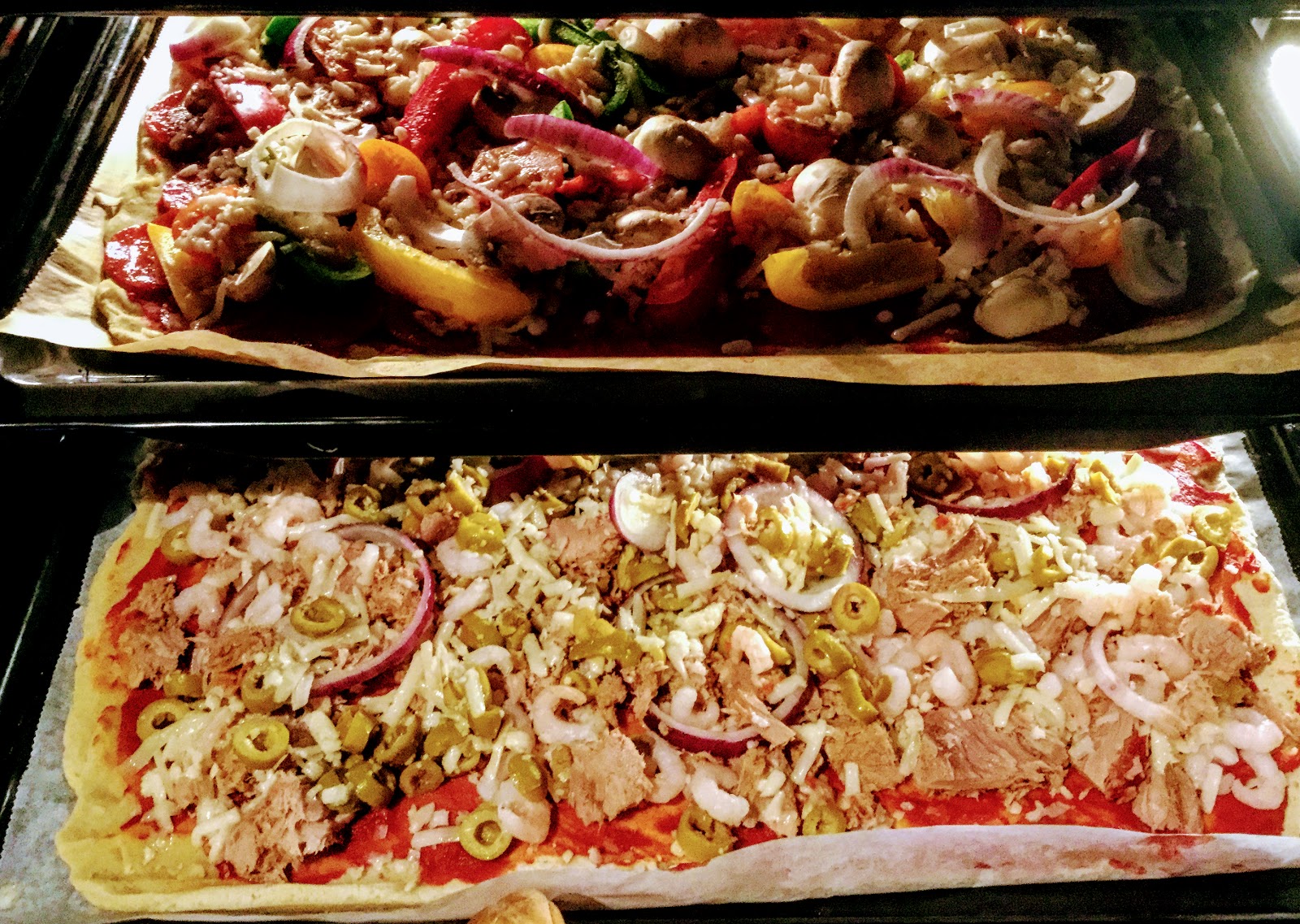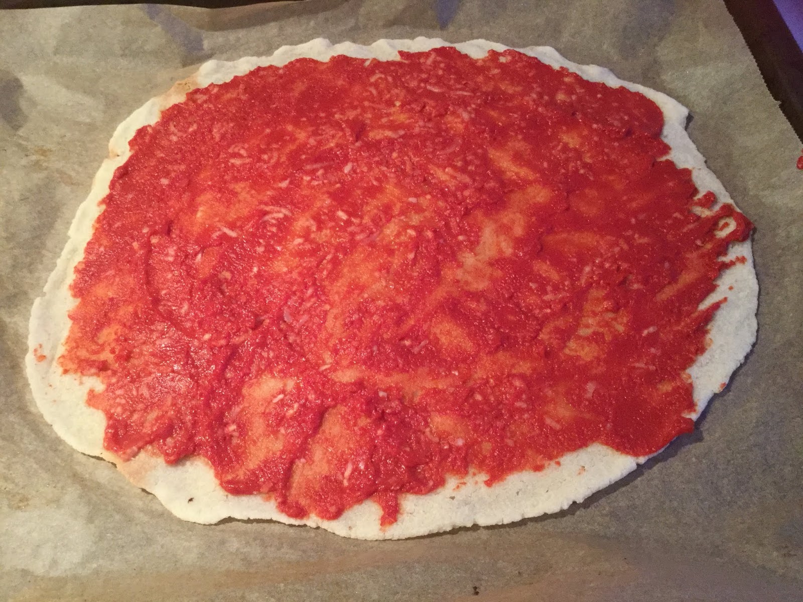 Esipaista pohjaa 200 asteessa noin viisitoista minuuttia – vain sen verran, että pohja on tarpeeksi kuivanut täytteiden levittämistä varten. Tässä välissä on hyvä pilkkoa valmiiksi haluamasi täytteet. Ne kukin valitkoon itse, suosikkipizza jos mikä on makuasia.