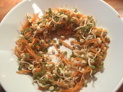 Laita riisinuudelit likoamaan kylmään veteen. Annostele kahdelle syvälle lautaselle idut ja porkkanaraaste. Levitä niitä lautasen reunoille ja jätä keskelle pieni kolo.