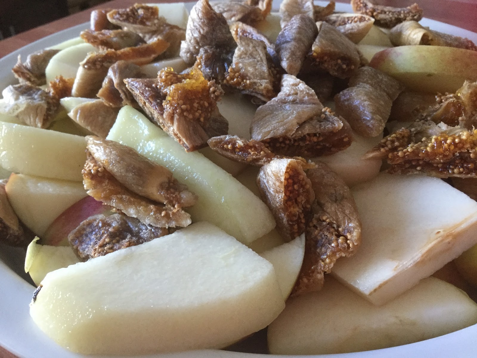 Viipaloi omenat ja päärynät, ja asettele ne uunin kestävään piirakkavuokaan. Leikkaa saksilla tai veitsellä viikunat pieniksi palasiksi hedelmälohkojen sekaan.