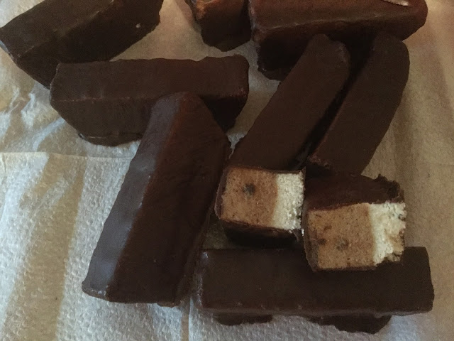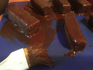 Nosta patukat jääkaappiin kovettumaan. Kun suklaapinta on täysin kovettunut, irrota patukat varoen leivinpaperista.