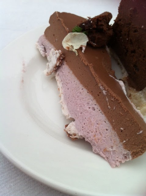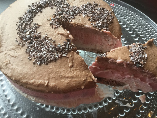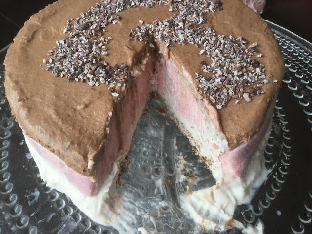 Kesän kunniaksi jätin itse pähkinät tällä kertaa pois ja tein jäätelökakkumaisen kerroskakun! Huomioi, että kuvissa kakkua ei ole vielä pakastettu, vaan se on otettu suoraan jääkaapista seuraavana päivänä. Kakku pysyy siis hyvin kasassa myös ilman pakastamista, jos et halua pakastekakkua valmistaa. Täytteet ovatkin ihanan pehmeitä ja suorastaan sulavat suussa!