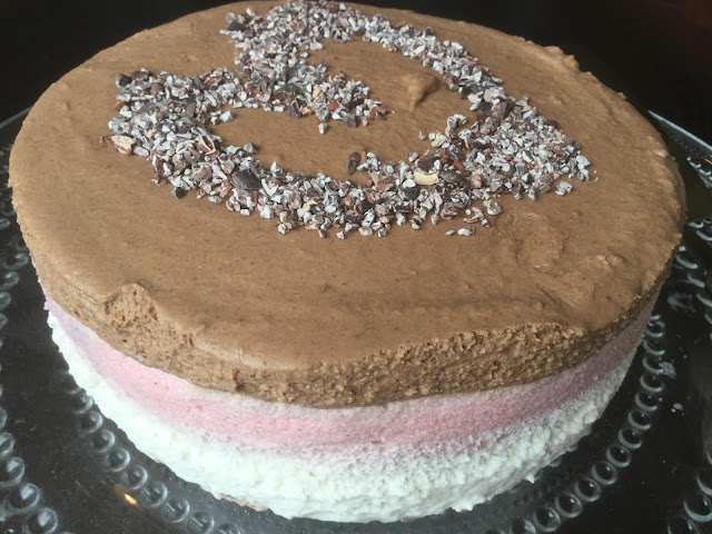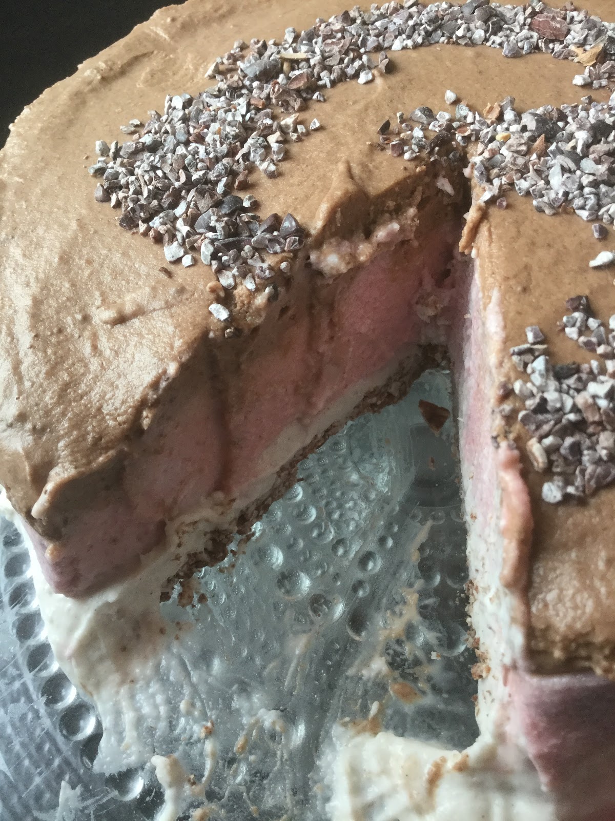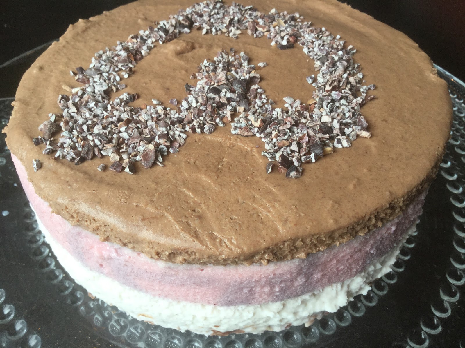 Kaunis, kuohkea, kesäinen raakakakku! Tai jäätelökakku. Jäinen raakakakku? Ihanaa! Triple layer raakakakku toimii myös muilla makuyhdistelmillä, mutta näillä kolmella ei voi koskaan mennä pieleen!