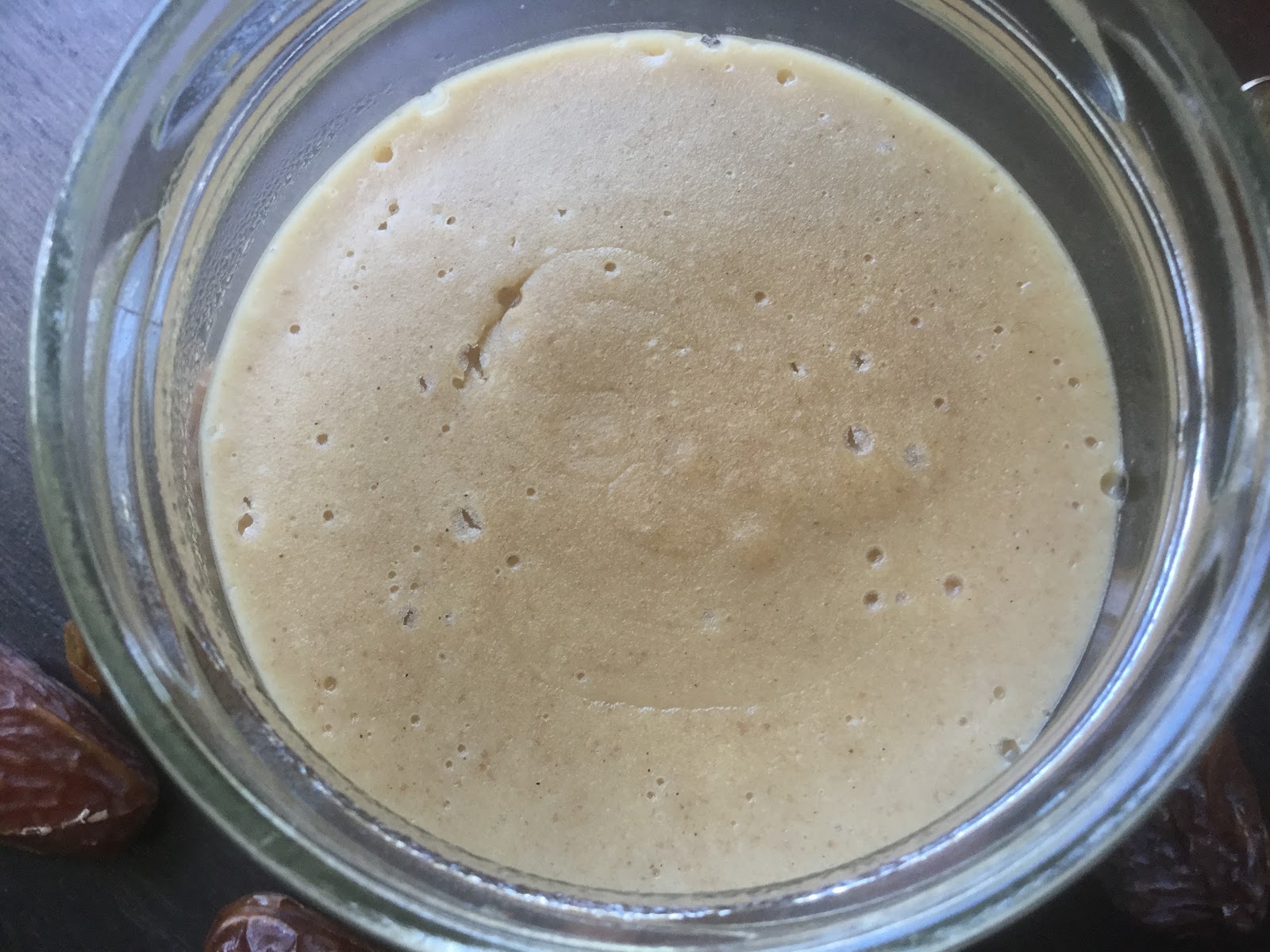 Kaada puolisen tuntia jäähtynyt nesteseos, riisiproteiini ja taatelit tehosekoittimeen ja työstä sileäksi. Lisää ripaus suolaa korostamaan toffeen makua.