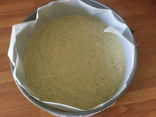 Pohjasta tulee kova, ja siitä syystä se kannattaa levittää mahdollisimman ohueksi. Itselläni oli käytössä isompi irtopohjavuoka, joka on noin 25cm leveä ja 7cm korkea. Jos käytät leveydeltään pienempää vuokaa, pohjan määrät kannattaa puolittaa, jotta pohjasta ei tule liian paksua ja mahdotonta leikata.