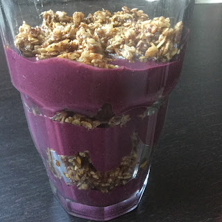 Sekoita mustikat, kookosmaito ja pähkinät tasaiseksi massaksi tehosekoittimella. Annostele smoothieta lasin pohjalle muutama ruokalusikallinen, ripottele päälle taikinamurua, ja toista, kunnes kaikki smoothie ja taikina on käytetty.