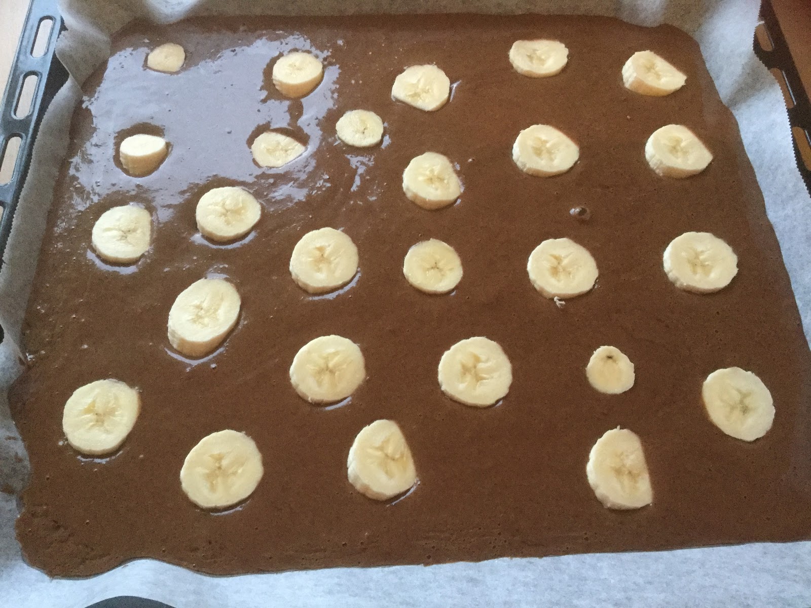 Jos haluat, pilko banaania taikinan pinnalle. Valitse itse kuinka paljon haluat. Omaani tuli yksi iso banaani, ja siitä riitti mukavasti joka puolelle taikinaa.
