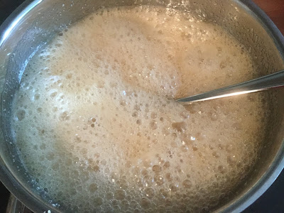 Sulata kookosöljy kattilassa ja lisää sekaan muut ainekset suklaata lukuun ottamatta. Sekoita huolella. Hauduta seosta miedolla lämmöllä koko ajan sekoittaen, kunnes se näyttää karamelliselta siirapilta. Tähän kuluu noin vartti. Älä jätä kattilaa vahtimatta, sillä seos kuplii hetkessä yli.