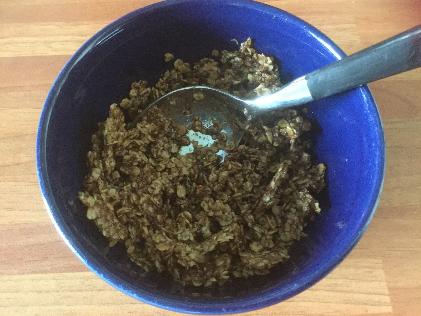 Sulata kookosöljy. Sekoita keskenään kaurahiutaleet, kookosöljy, kookossokeri ja mausteet. Levitä massa uunipellille levyksi ja paahda 200 asteessa noin 15 minuuttia. Anna levyn jäähtyä, ja murra se sen jälkeen pienemmäksi muruksi.