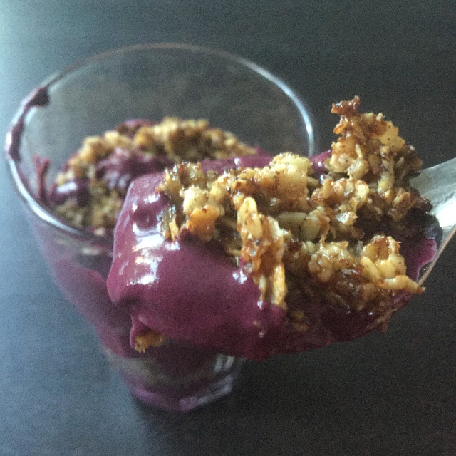 Sekoita mustikat, kookosmaito ja pähkinät tasaiseksi massaksi tehosekoittimella. Annostele smoothieta lasin pohjalle muutama ruokalusikallinen, ripottele päälle taikinamurua, ja toista, kunnes kaikki smoothie ja taikina on käytetty.