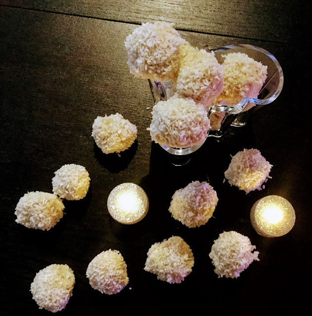 Talvella lumihiutaleiden sadellessa maahan (tai niitä lumihiutaleita odotellessa…) on hauska lisätä pientä talvisuutta myös herkkuihin. Pakkasten kiristyessä maistuvat valkosuklaiset, kookoshiutaleilla koristellut valkosuklaatryffelit, joista tulee mieleen pienet lumipallot.