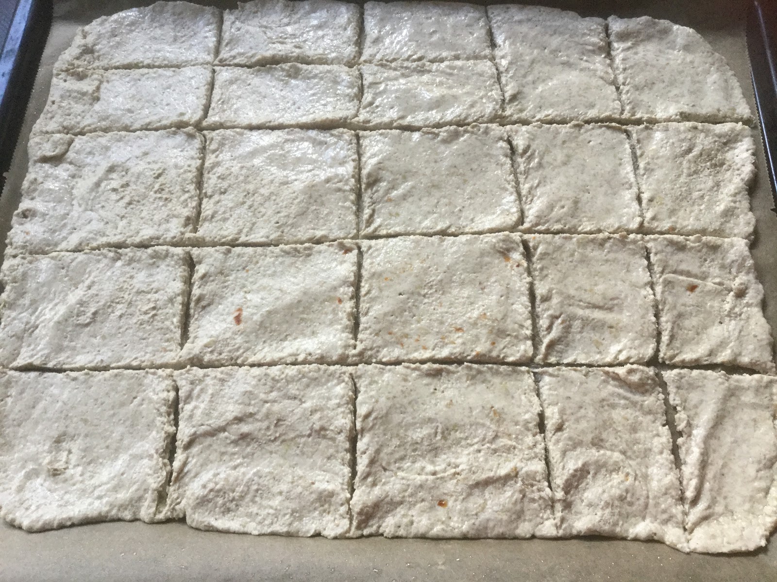 Sekoita keskenään kuivat aineet, lisää vesi sekä vaahterasiirappi ja sekoita huolella. Kumoa taikina uunipellille leivinpaperin päälle, aseta sen päälle toinen leivinpaperi, ja levitä taikina käsin tai kaulimen avulla tasaiseksi pellin kokoiseksi levyksi. Irrota päällimmäinen leivinpaperi ja leikkaa taikinaan viillot valmiiksi sopivan kokoisia paloja varten.