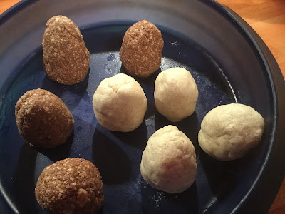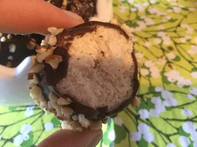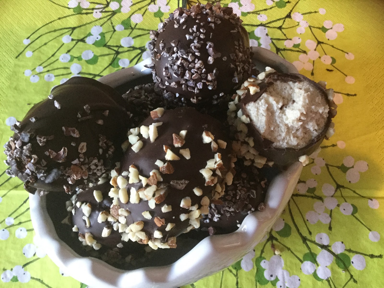 Valmistin ensin moussetäytteen, annoin sen jähmettyä hetken kylmässä ja sen jälkeen pyörittelin siitä pieniä moussepalloja, jotka päällystin suklaalla. Valmistustapa vaatii hieman jämäkämpää täytettä, ja sen vuoksi päätin valmistaa hieman tuhdimpaa moussetäytettä. Psyllium tekee moussepalloista helposti käsiteltäviä, hyvin jähmettyneitä ja silti ilmavia ja kuohkeita. Munasta haukatessa vastassa onkin täydellisen kuohkea ja pehmyt täyte!