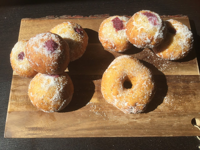 Tällä ohjeella tulee 12 keskikokoista hillomunkkia. Tai meidän tapauksessamme 11 munkkia ja yksi rinkilä!