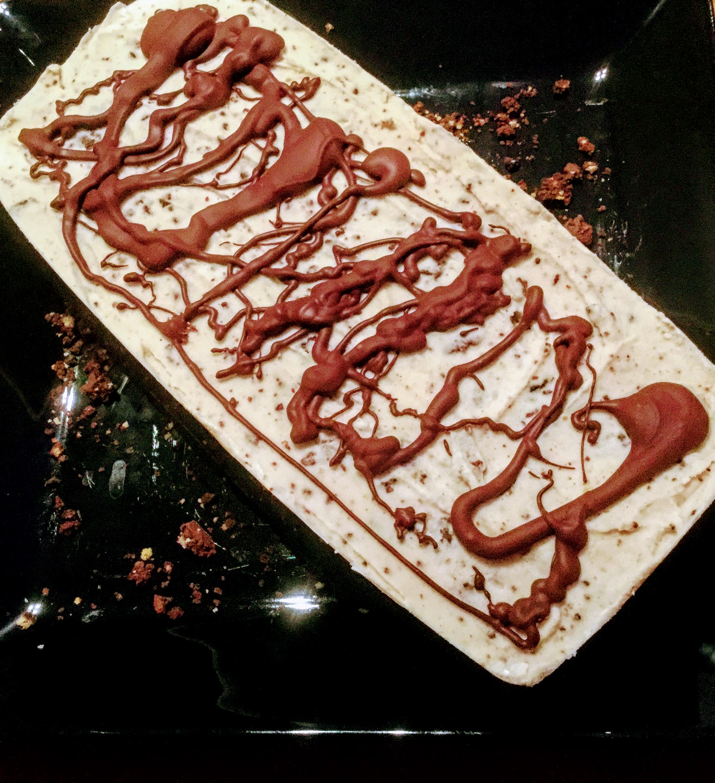 Kaada 2dl keksimuruista jäätelömassan sekaan. Anna koneen pyöriä vielä 10-15 minuuttia. Kaavi jäätelöseos kulhosta vuokaan pohjan päälle, ja pakasta suunnilleen tunniksi.
