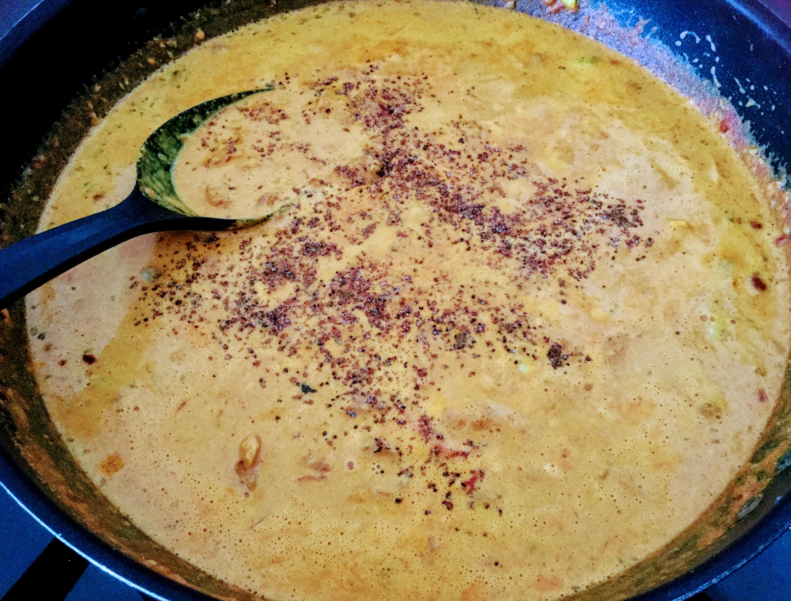 Lisää pannulle tomaattimurska sekä kookosmaito (ja sipulinvarret) ja sekoita huolella. Madalla lämpöä ja anna seoksen hautua hiljalleen puolisen tuntia.