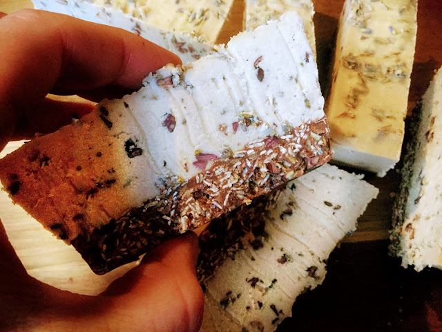 Kiireisten viikkojen aikana olen todella päässyt hullaantumaan laventeliin. Laventeliin ihastuminen voi vaatia tottumattomalta hetken aikaa, mutta kun laventelin makuun pääsee ei enää olekaan päivää ilman. Laventelitee on klassikko, jossa tämä kukkaismauste toimii loistavasti. En ole viime aikoina Kuitenkaan kaivannut kuumaa teetä, mutta sitäkin enemmän maukkaita raakaherkkuja, minkä vuoksi yhdistin laventelin täydellisen kermaisiin raakasuklaapatukoihin. Laventeli-raakasuklaapatukat ovat hurmaava kombo täyteläistä suklaata ja lempeän rauhoittavaa, huumaavan tuoksuista laventelia.
