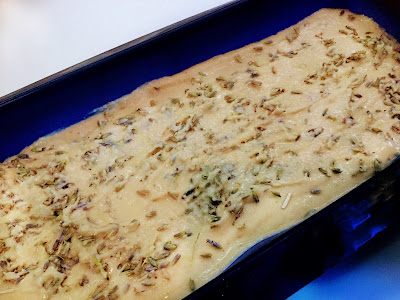Kaada massa vuokaan pohjan päälle ja halutessasi ripottele pinnalle lisää laventelia koristeeksi.