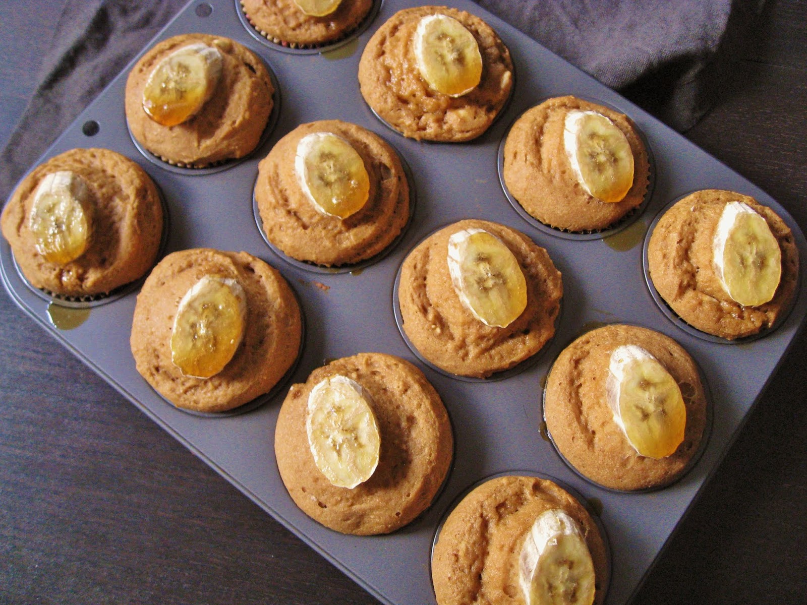 Kaada taikina muffinssivuokaan ja koristele niiden pinta banaanin paloilla. Halutessasi voit myös lirauttaa pinnalle hieman vaahterasiirappia, jolloin muffinssien pinnasta tulee ihanan rapea.