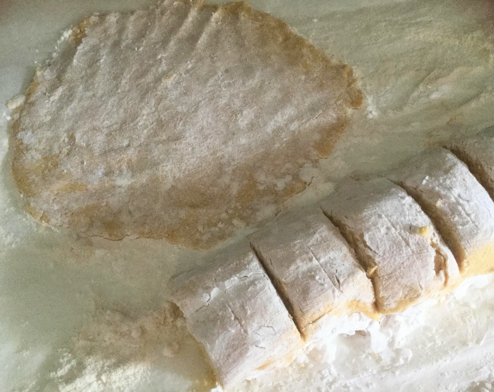 Jauhota pöytä tai leivonta-alusta perunajauhoilla, ja kaulitse tai muotoile käsin taikinan paloista ohuita pyöreitä levyjä.