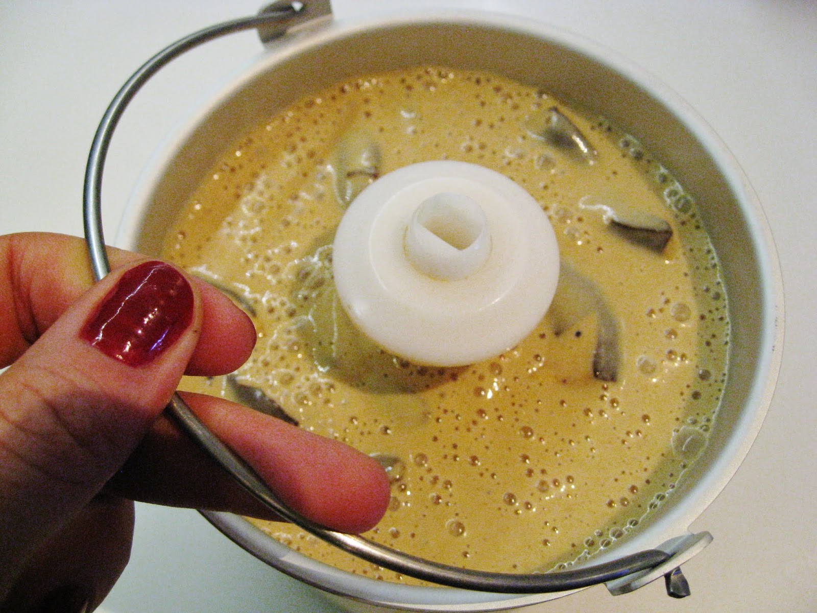 Sekoita tehosekoittimella tai sauvasekoittimella kaikki ainekset omenarenkaita lukuun ottamatta. Kun ainekset ovat kunnolla sekaisin, lisää omenarenkaiden palaset.
