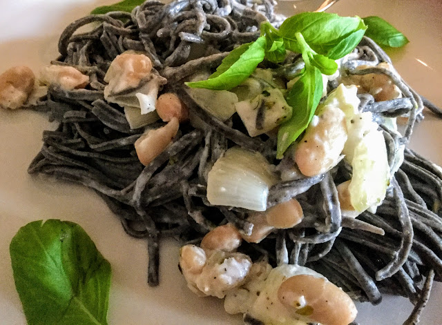 Tämä papupasta on uusi kokeilu, ja todellakin silkkaa papuvoimaa, sillä papupitoisen kasviskastikkeen lisäksi herkullinen tagliatelle on valmistettu papunuudeleista. Hauskaa ulkonäköä aterialle sai valitsemalla mustia nuudeleita.