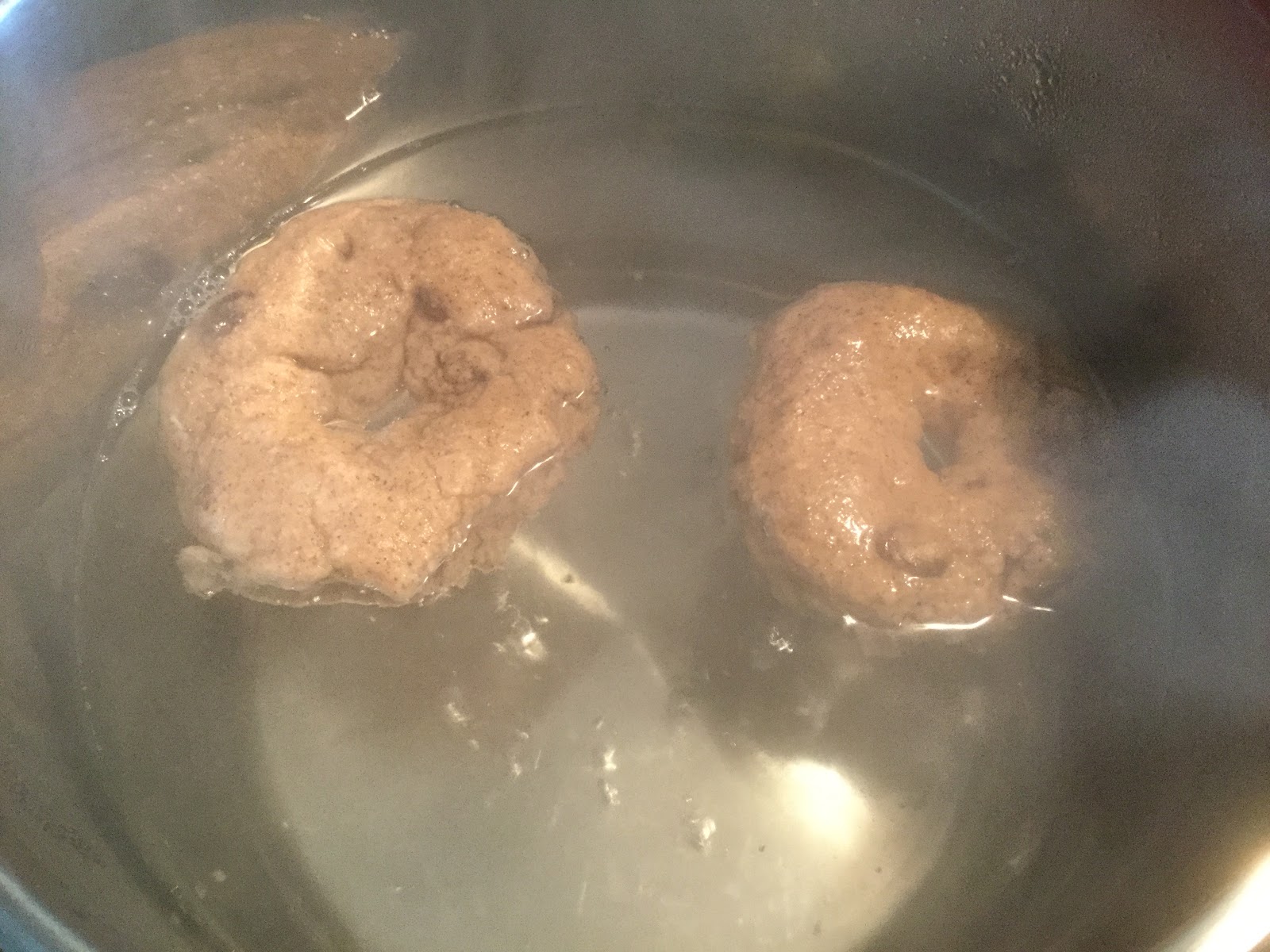 Kiehauta kattilassa 3-4 litraa vettä ja madalla lämpöä sen verran, että vesi kiehuu hiljalleen. Keitä bageleita kiehuvassa vedessä muutama minuutti molemmin puolin. Bagelit on aika vaikea saada nostettua siististi veteen, koska taikina on aika löysää ja kohonneena ilmavaa. Koita saada bagelit kaavittua paistinlastan tai vastaavan päälle, jolla kippaat ne veteen.
