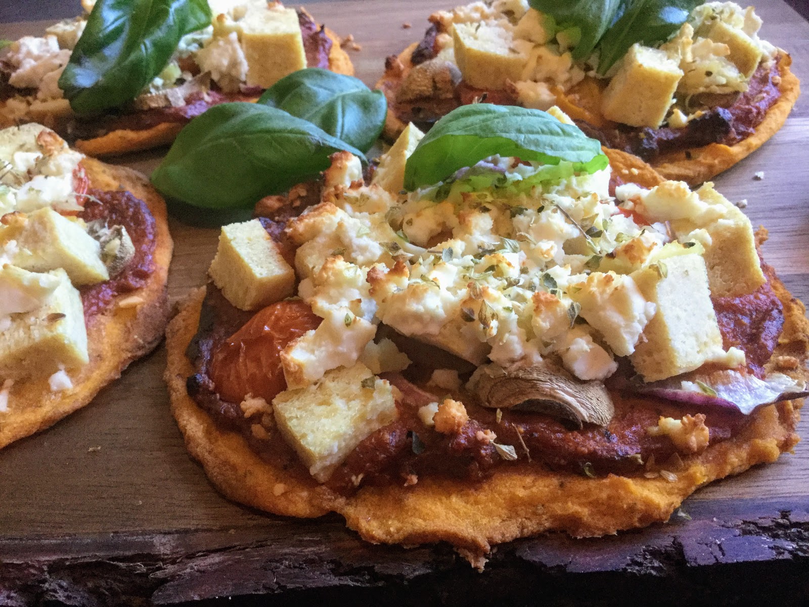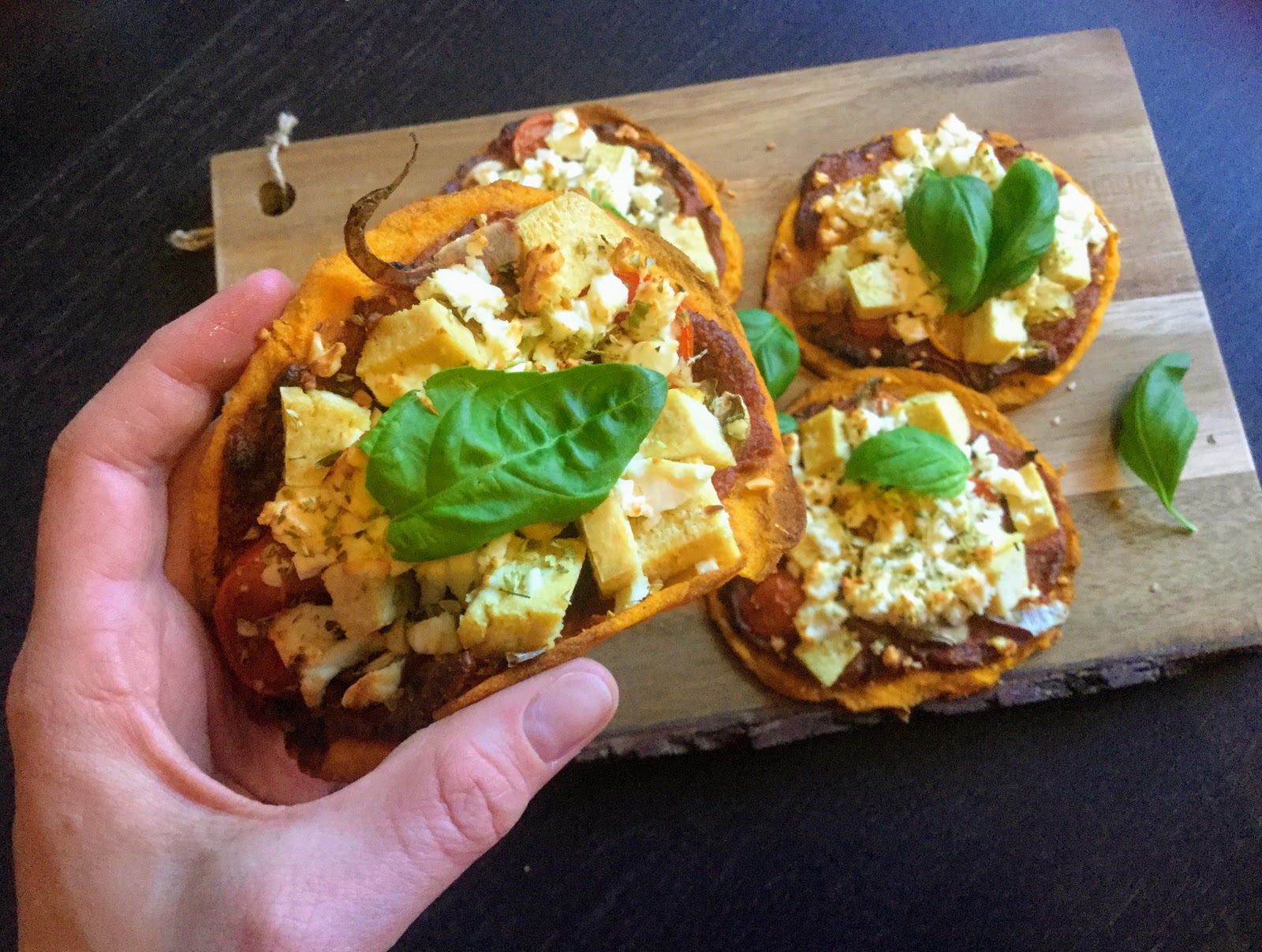 Periaatteessa voit käyttää täytteessä marinoitua tofua, mutta kannattaa huomioida, että se voi sotkea kokonaisuutta. Itse halusin jättää paljon tilaa juuri pestolle ja valkosipulille, enkä viedä huomiota marinoiduilla täytteillä. Hampunsiementofu sen sijaan menee kyllä kokeiluun! Bataattipizzat saavat runsaasti makua myös bataattipohjasta, joten täytteet voi pitää aika yksinkertaisina.
