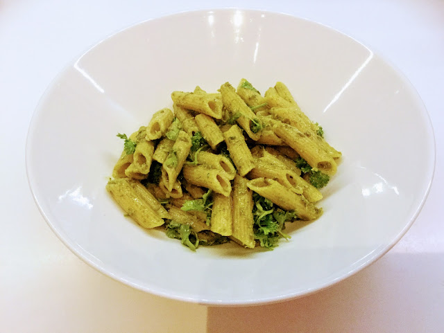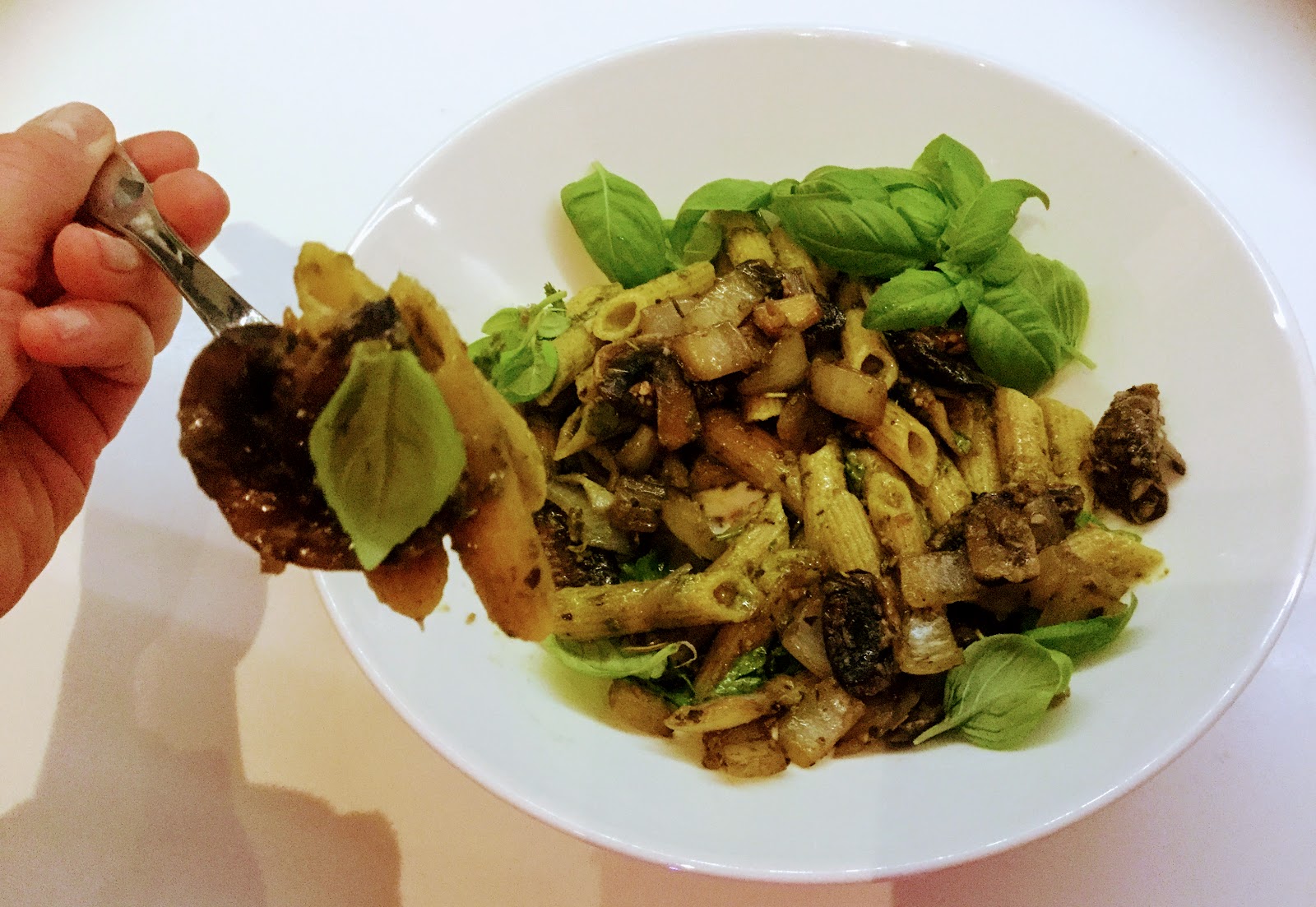 En ollut pitkään aikaan nauttinut ihan rehellistä pastaa, ja sitten siihen iskikin ihan kunnon himo. Halusin täyteläistä, kermaista pastaa, mutta kasviksilla maustettuna. Kotona kaapit ammottivat melko tyhjinä, joten pasta oli koottava niillä aineksilla mitä sattui löytymään. Herkkusieni-pestopasta valmistuu nopeasti, ja mies totesi sen olevan ”ravintolatasoinen ruoka”.