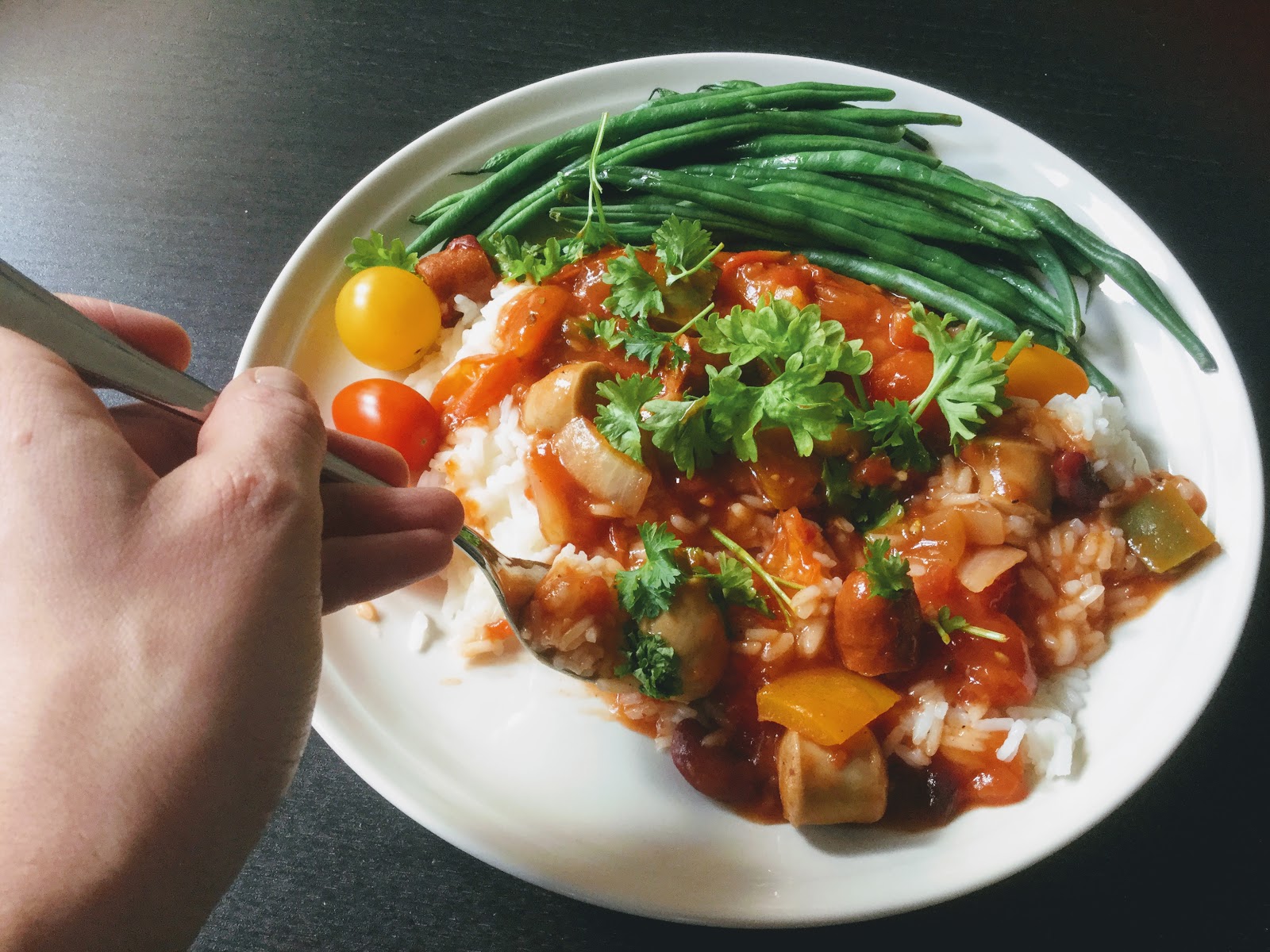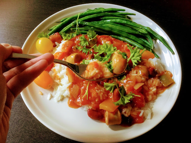 Vaihtelua saa helposti lisuketta vaihtelemalla. Kuvausannokseen kuului riisi, mutta seuraavana päivänä söin pataa keitetyn tattarin kanssa. Myös kaurarouhe sopisi varmasti loistavasti.