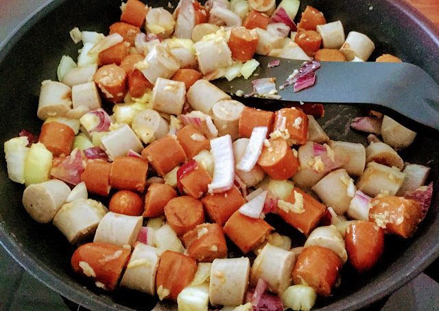 Pilko makkarat pienemmiksi palasiksi ja sipuli sekä valkosipuli pieneksi silpuksi. Ruskista makkarat nopeasti pannulla ja lisää silputut sipulit. Kaada seos uunipadan tai haudutuspadan pohjalle.