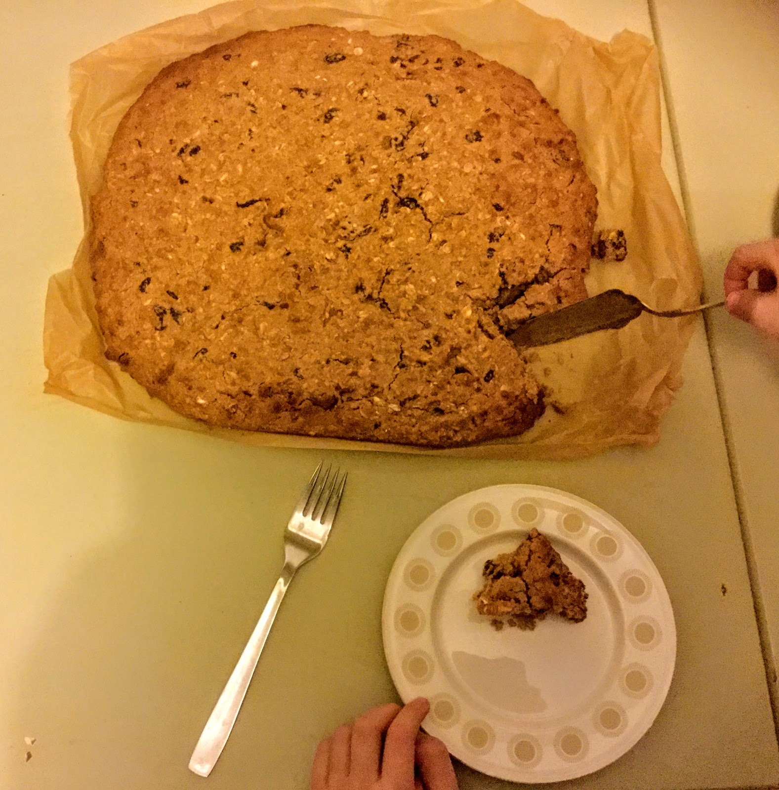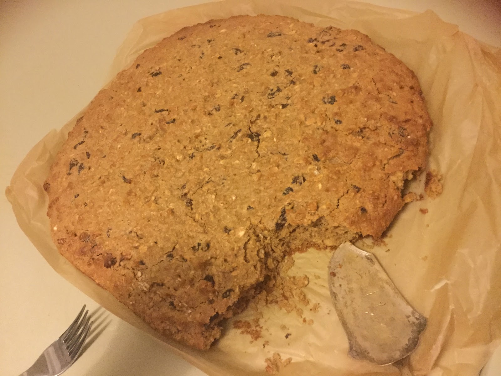 Mietimme lasten kanssa mihin tätä leivosta parhaiten vertaisi. Pellille levitettynä siinä on jotakin pannukakkumaista. Taikina on selkeästi keksitaikinaa. Valmis keksi on koostumukseltaan melko kakkumaista, mutta muistuttaa myös rusinapuuroa.