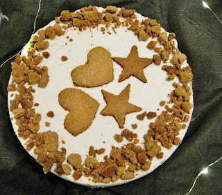 Koristele kakku piparkakuilla ja säilytä valmis kakku kylmässä.