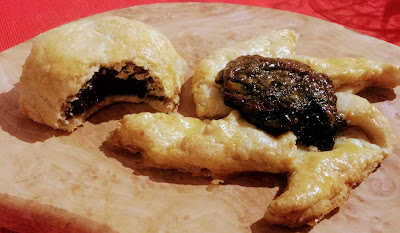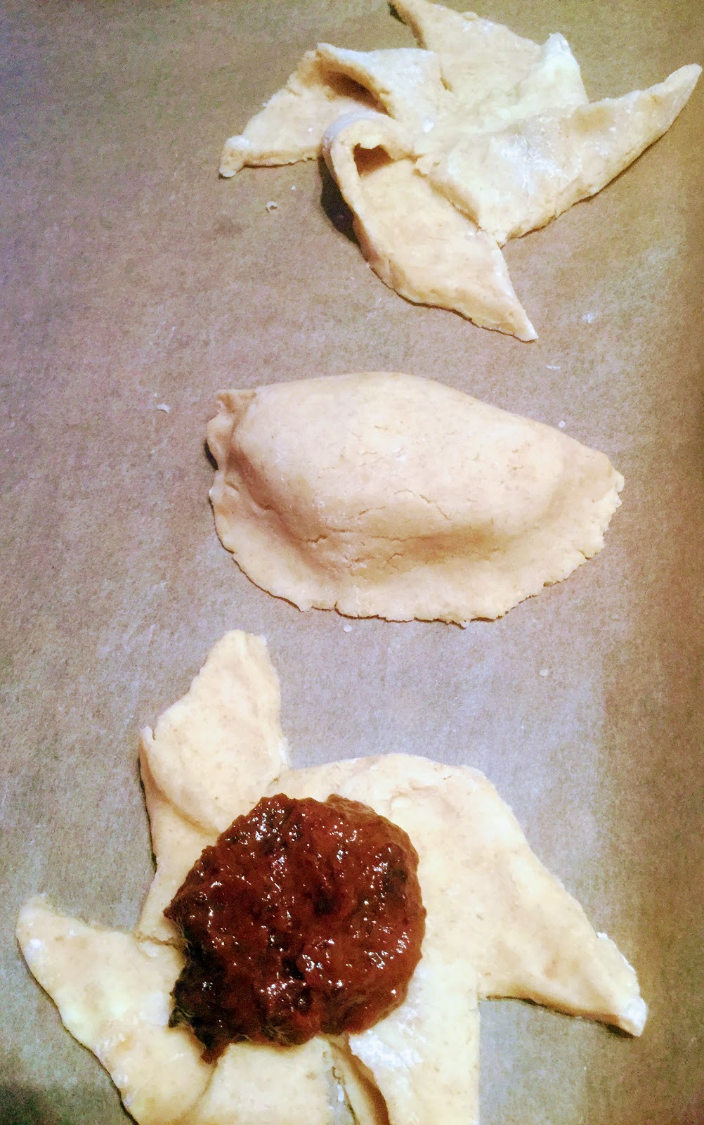 Tällä ohjeella tulee yksi täyteen ahdettu pellillinen. Tein kahdeksan kappaletta molempia laatuja – tähden ja (tavallaan) puolikuun muotoisia. Tähdet ovat kauniimpia, mutta puolikuut vielä parempia, koska hilloa on joka puolella!