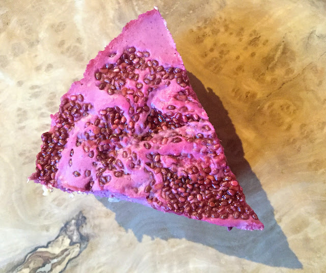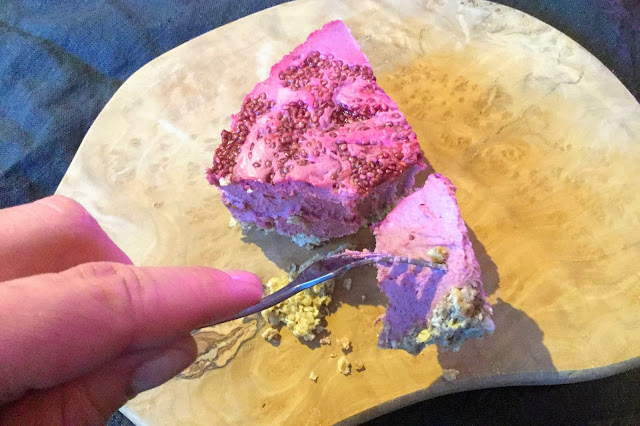 Huomioi, että jos käytät kertaalleen sulatettuja pakastevadelmia, kakkua ei kannata pakastaa enää uudelleen. Paitsi jos käytät ulkomaisia marjoja ja kuumennat ne ennen käyttöä. Tällöin vadelmaosuus ei tietenkään ole enää raaka, mutta eihän se aina niin justiinsa ole. Paljon hyviä ravinteita ja ennen kaikkea makua tässä kakussa on silti!