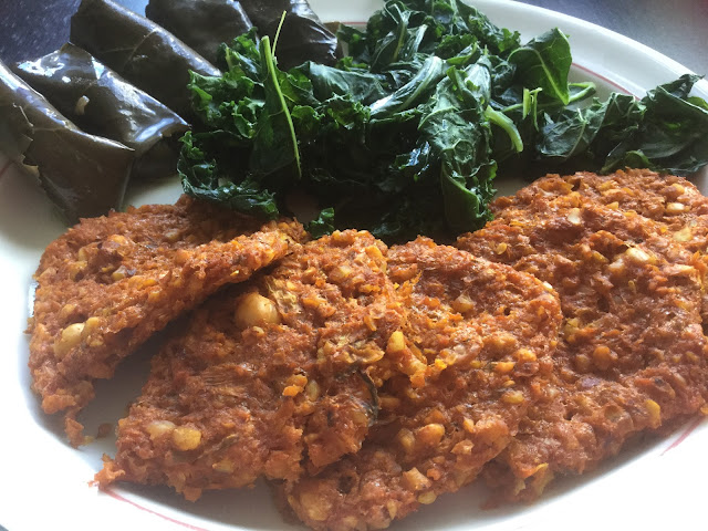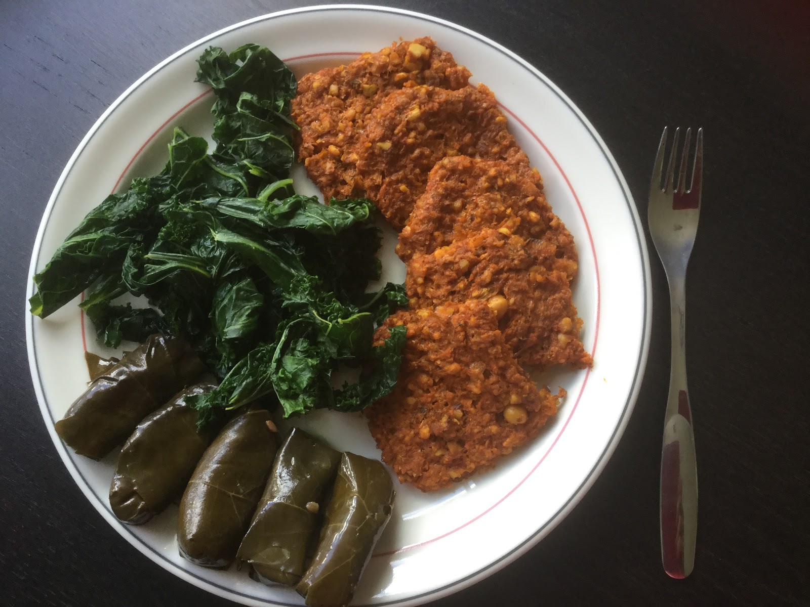 | Miten herkullinen annos syntyykään kasvispihveistä, viininlehtikääryleistä ja höyrytetystä lehtikaalista! |