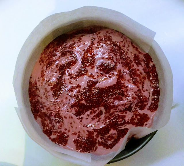 Voit koristella kakun pinnan kokonaisilla vadelmilla tai kauniilla chia-hillolla, jonka ohjeen löydät täältä.