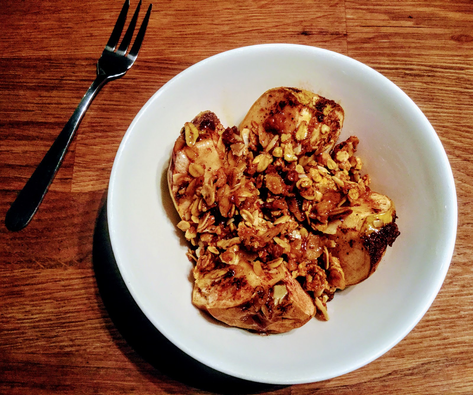 Granolasta saa uuniomenalle maukkaan, rouskuvan täytteen, mikä antaa uuniomenalle ihanaa suutuntumaa ja tekee annoksesta piirakkamaisen.