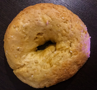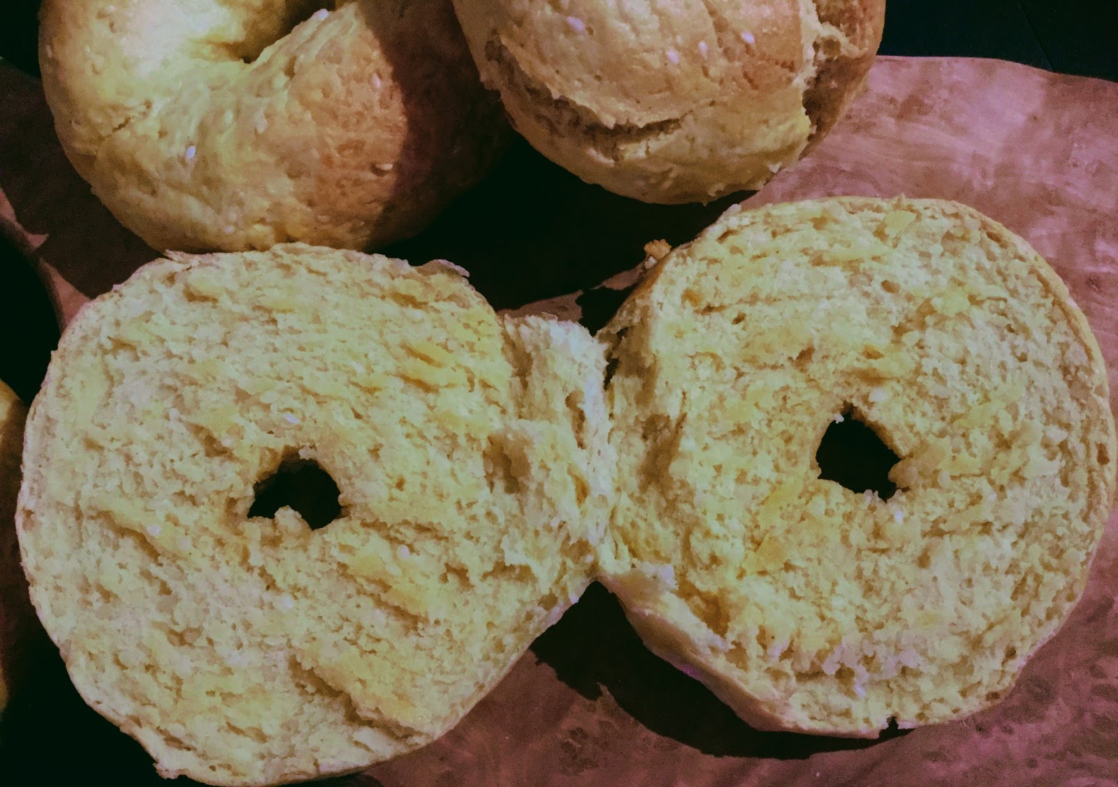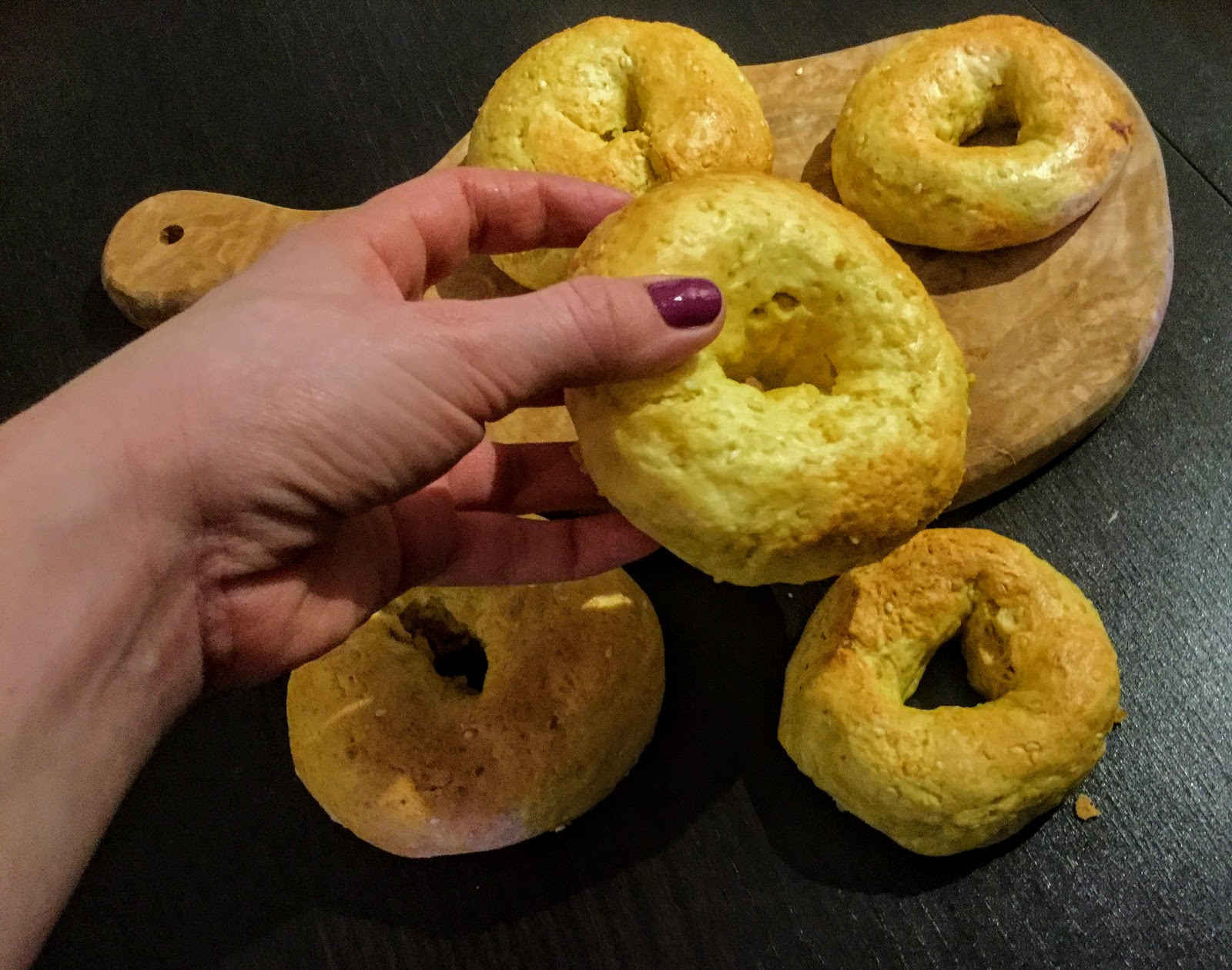Tällä kertaa bagelin koostumus ylitti jopa edellisen, vaikka lähes täydellisinä pidin jo niitäkin. Tässä bagelin sitkeys ja nahkeus pääsevät vielä paremmin esiin. Joten vegaanit, ei huolta. Ei se resepti kananmunaa vaadi. Kananmuna lähinnä sitoo taikinaa, mutta kaikeksi onneksi psyllium ajaa saman asian.
