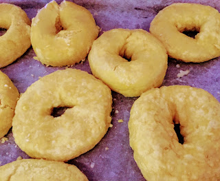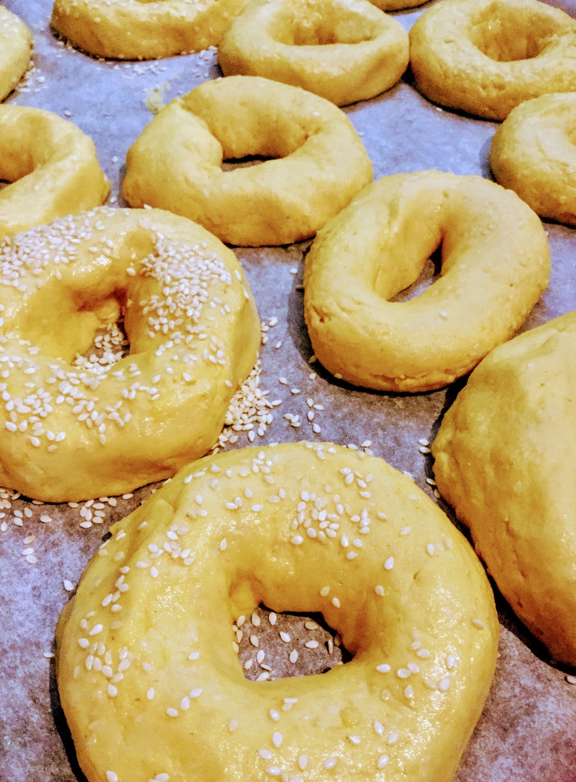 Keitä kattilassa muutama litra vettä. Muotoile taikinasta pitkä tasapaksu pötkö, ja leikkaa se yhtä suuriin osiin. Minulla tuli 13 palaa. Pyörittele jokaisesta palasesta tasapaksu pötkö, jonka päät taitat yhteen rinkelimäiseksi. Taputtele pinta tasaiseksi ja bagel kauniin pyöreäksi. Laita muotoillut bagelit pari kerrallaan kiehuvaan veteen.