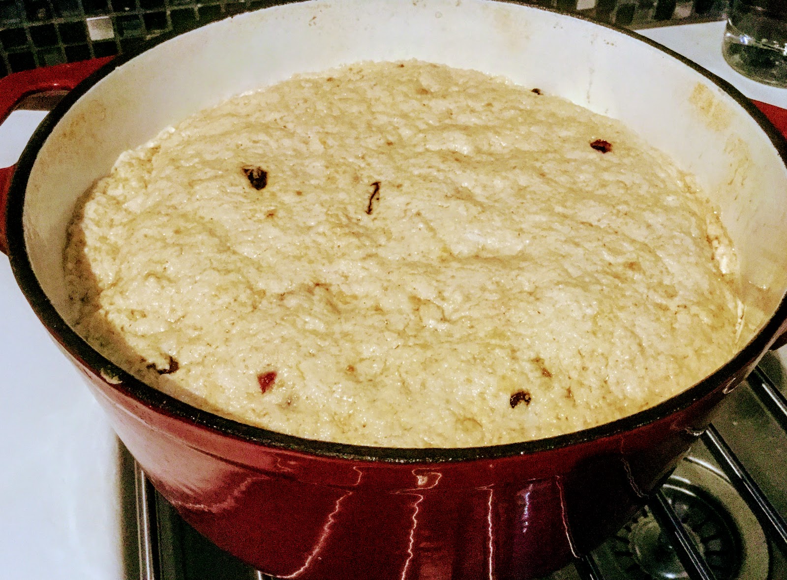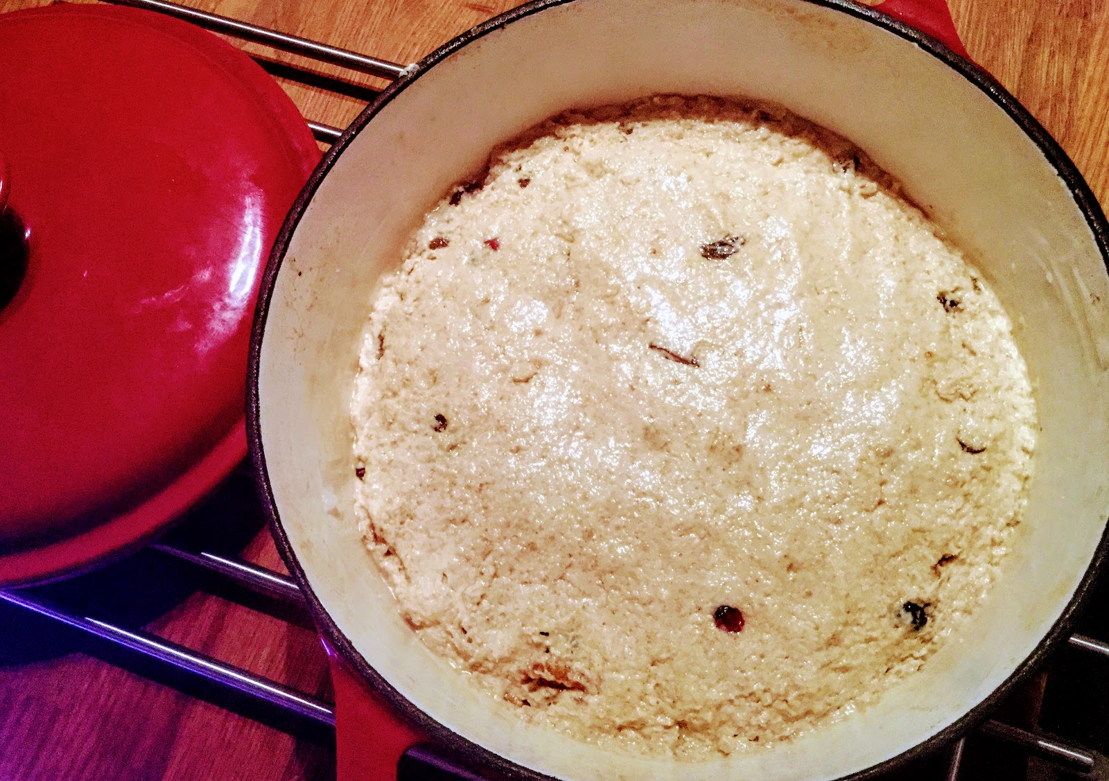 Kypsennä uunissa 200 asteessa noin 60 minuuttia. Pidä padassa kansi päällä, niin leipä säilyy pehmeämpänä. Rapeaa kuorta kaipaaville sitten kansi pois päältä.