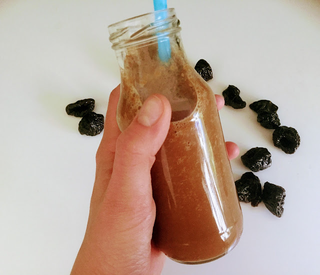 Liottamisen jälkeen kaada luumut ja liotusvesi sekä muut ainekset tehosekoittimen kannuun ja sekoita sileäksi, juoksevaksi nesteeksi. Voit myös käyttää sekoittamiseen sauvasekoitinta.