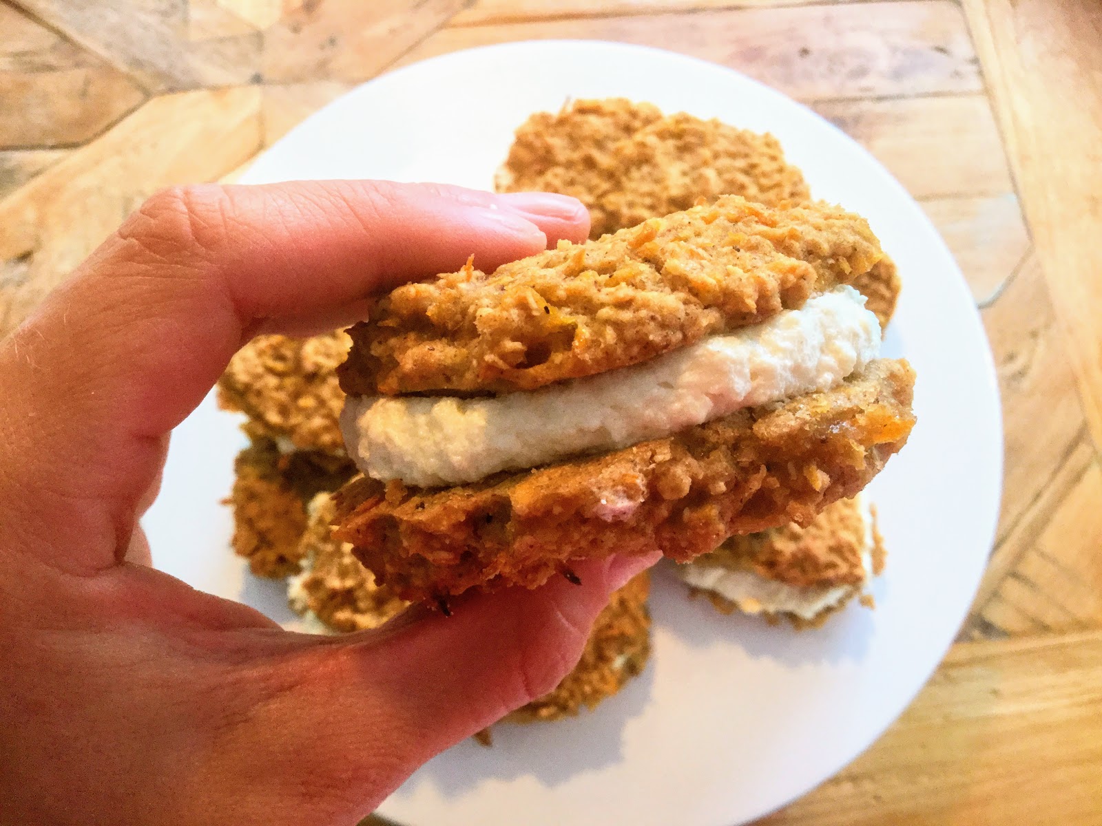 Porkkanakakku täytekeksit paranevat vielä jääkaapissa, kun keksit pääsevät oikein kunnolla mehevöitymään. Oli kuin olisi nautiskellut raakaa keksitaikinaa – mielettömän herkullista! Joten leivo porkkanakakku täytekeksejä huoletta valmiiksi vaikka jo päivää tai paria ennen tarpeellista hetkeä, ne eivät siitä kärsi!