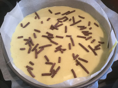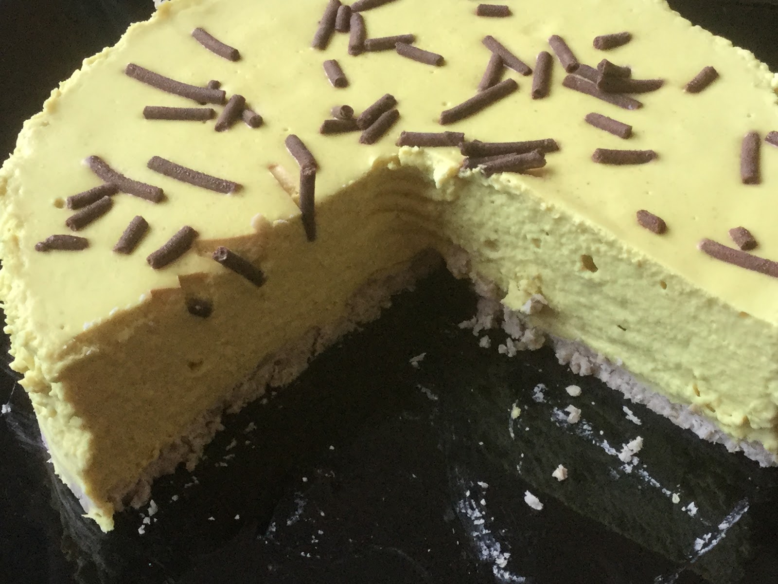 Kakun pinnalle voi ripotella erilaisia koristuksia, kuten kookoshiluja, mausteita tai raakasuklaata, kuten kuvassa näkyy. Päällysteet jähmettyvät kakun pintaan mukavasti kiinni.