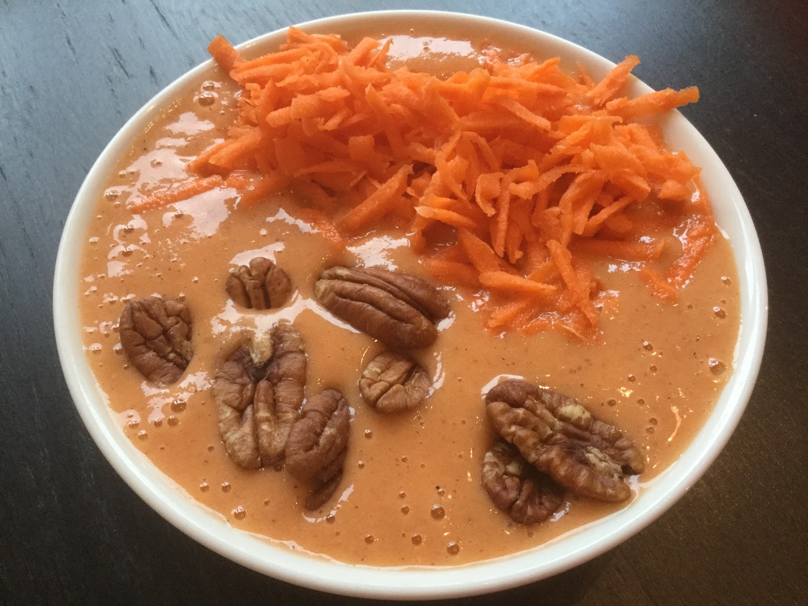 Porkkanakakku smoothiebowl maistuu porkkanakakulle ja sen ihanille mausteille, mutta on myös raikas ja viileä kokonaisuus. Banaani tuo smoothieen lempeää makeutta, mutta ei peitä porkkanan ja mausteiden makua alleen.