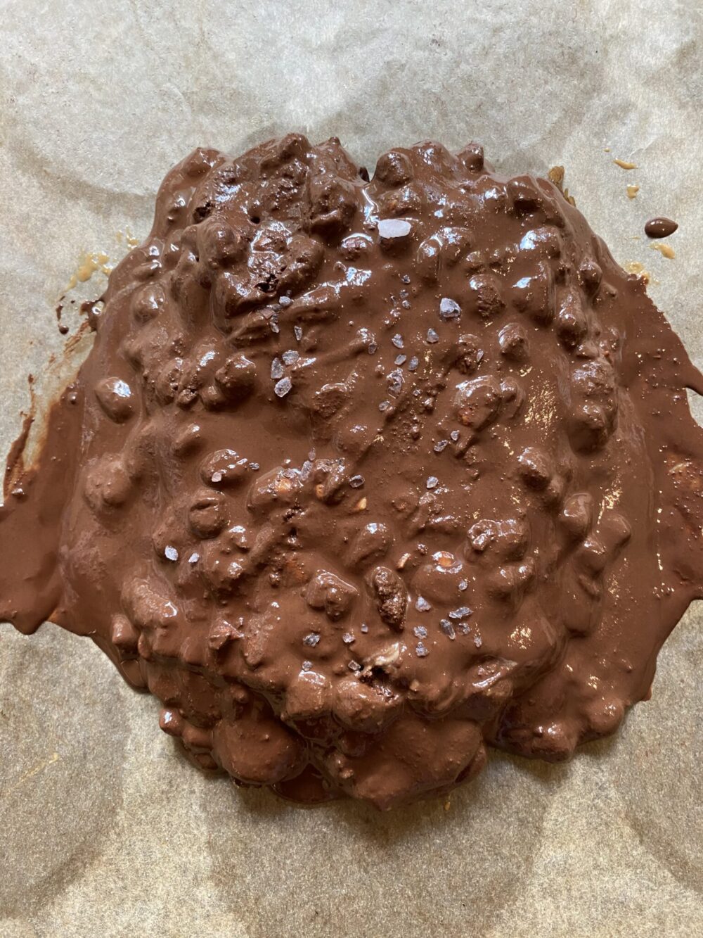 Sulata suklaa ja kookosöljy ja sekoita ne hyvin yhteen. Levitä seos muiden ainesten päälle niin, että se peittää koko levyn. Ripottele sulan suklaan päälle merisuolahiutaleita.