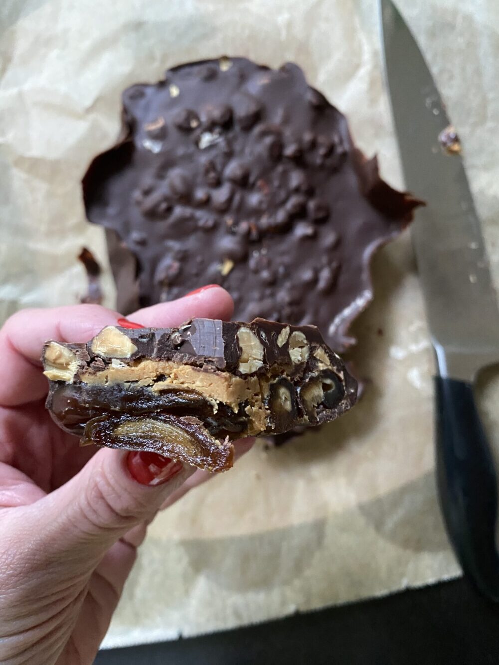 Miltä Date bark / taatelilevy sitten maistuu? Siinä on taatelista tulevaa toffeemaisuutta, mikä korostuu silmiä pyöräyttävän upeasti merisuolan kanssa. Jokainen maapähkinävoin ystävä tietää miten hyvää Snickersit on – ja tästä tulee hyvin elävästi Snickers mieleen. Se ei ole kuitenkaan yhtä imelää, vaan aitojen makujen juhlaa. Täydellinen esimerkki terveellisestä herkusta, jonka jälkeen ei kaipaa mitään keinotekoista tai ylimakeaa. Ja variaatioita on muuten vaikka kuinka!