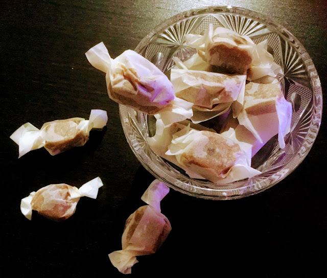 Makeita, mutta terveellisempiä vaihtoehtoja naposteluhetkiin! Vegaaninen joulufudge kääriytyy suloisiksi karkkipalasiksi voipaperin sisälle ja siitä saa kasattua suloisia pieniä herkkupusseja kylään viemisiksi tai karkkikippoja omaan joulupöytään.
