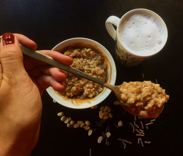 Kookos- ja mantelimaidon sekoitukseen valmistettu vaahtoava latte sopii puuron oheen kuin nakutettu! |