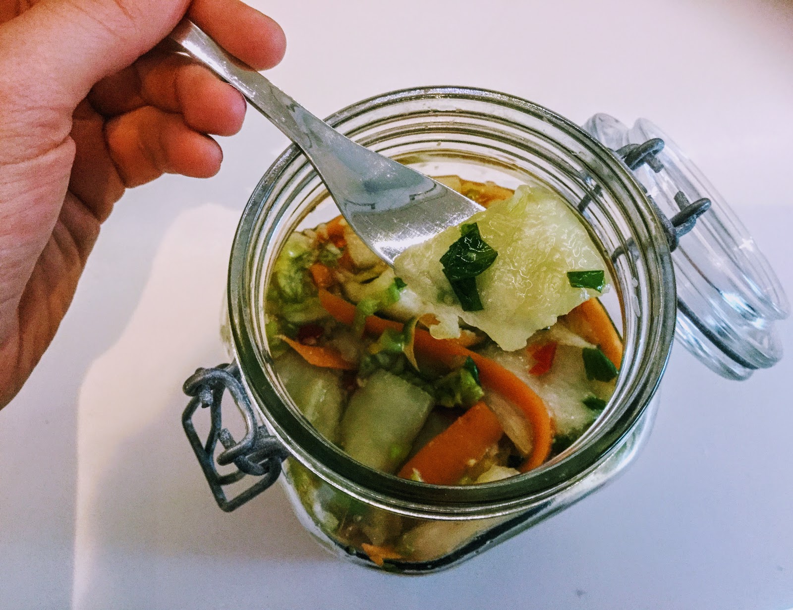 Kolmen päivän kohdalla ainekset ovat hyvin pehmenneet ja nesteessä on kuplia. Seuraavana päivänä laitoin kimchin jääkaappiin syötäväksi. |